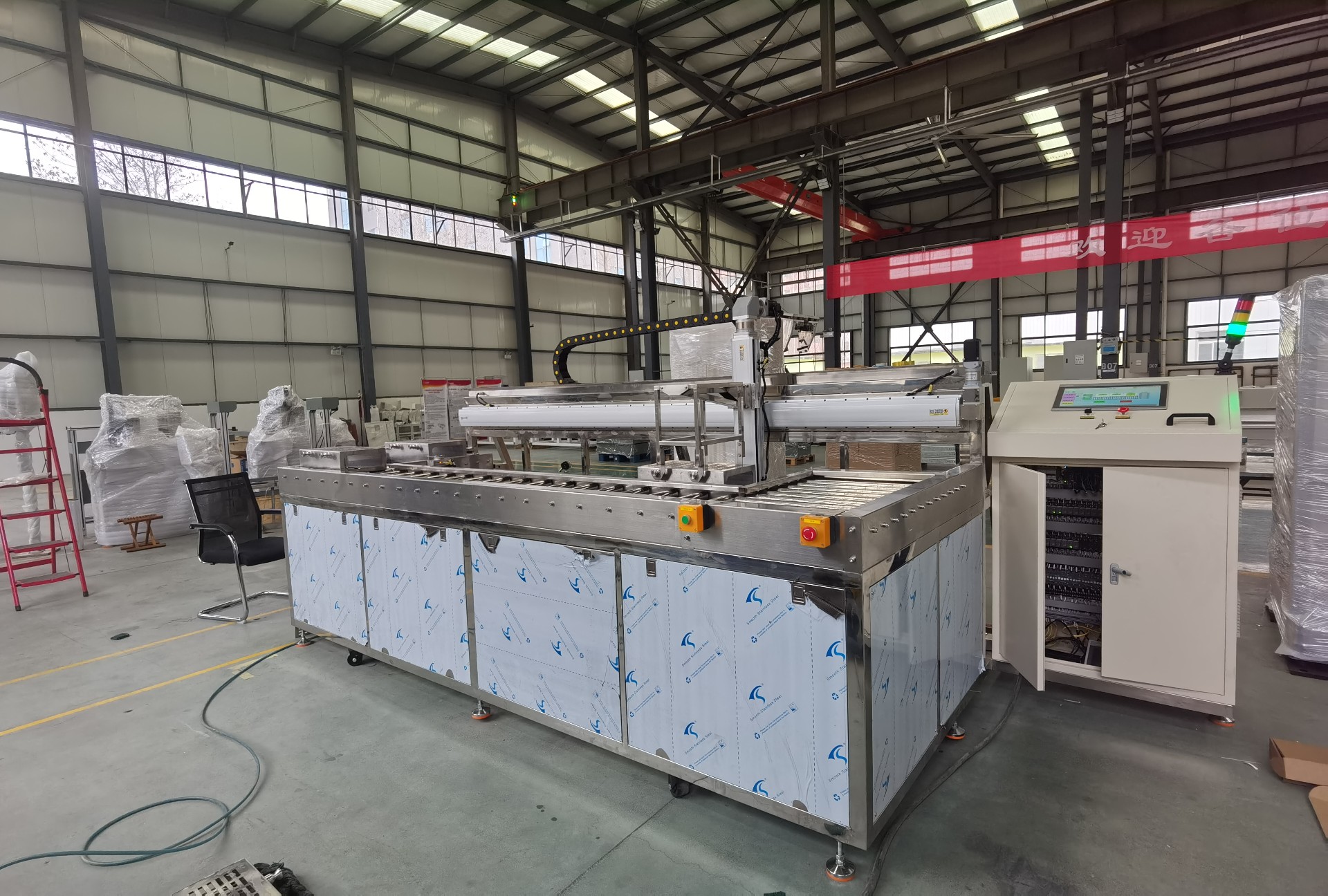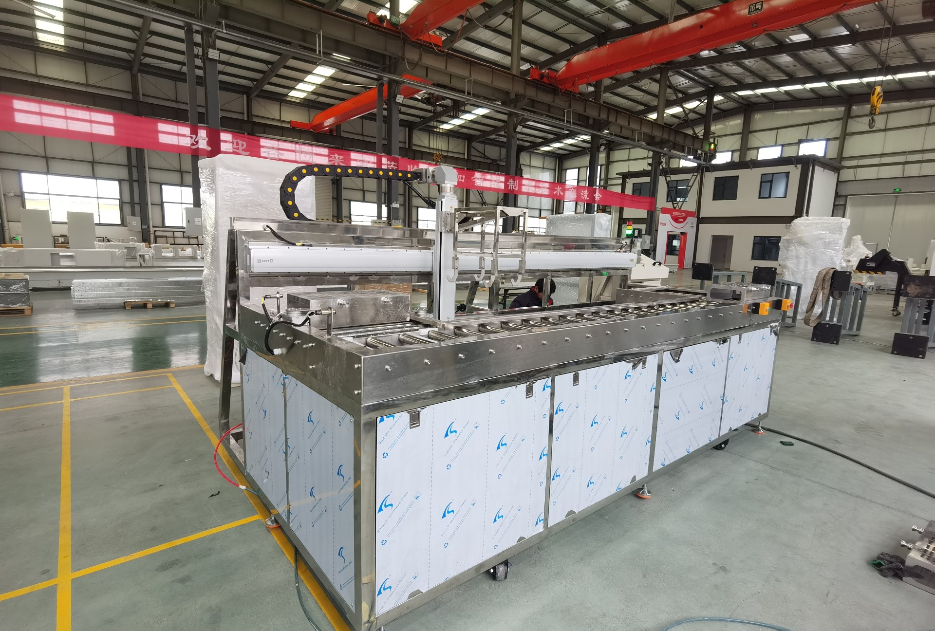 設(shè)備描述:該設(shè)備是一套敞開式全自動(dòng)單臂式超聲波清洗機(jī),由不銹鋼材質(zhì)制作的超聲波除油清洗槽、超聲波漂洗槽、熱風(fēng)循環(huán)烘干槽。工作程序:采用全自動(dòng)單臂式機(jī)構(gòu)傳送料筐從左進(jìn)右出,工件料筐放在上料臺(tái)位置通過機(jī)器人擺放凸輪片,在上料臺(tái)位置擺放好工件后機(jī)器人給清洗機(jī)一個(gè)信號(hào)料筐自動(dòng)進(jìn)入到清洗機(jī)上料位置,機(jī)械手過來提取料筐放入到第一個(gè)清洗槽內(nèi)對(duì)工件表面的油污等附著物清洗,烘干完畢后機(jī)械手將從烘干槽內(nèi)提出料筐放到下料臺(tái)上,操作者將工件從料筐內(nèi)取出完成清洗工作。在把空料筐放到回轉(zhuǎn)輸送線上自動(dòng)回到上料位置。