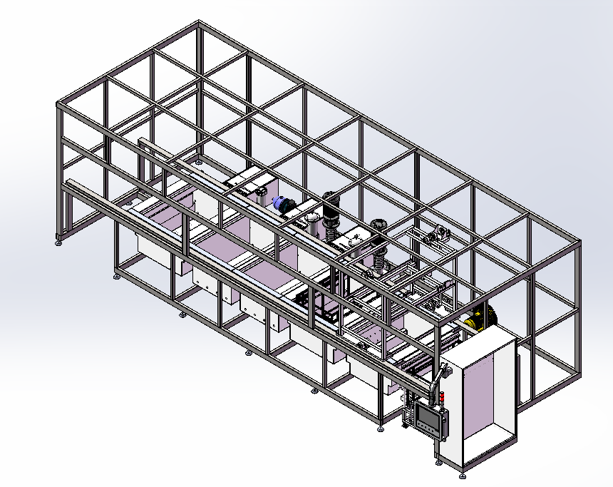 工作程序:設(shè)計為全自動龍門式傳遞形式,傳遞工件料籃形式從左進(jìn)右出;工件料籃通過自動傳送系統(tǒng)進(jìn)行自動進(jìn)料和自動出料。